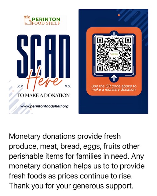 Thank you to the out pouring of donations from the Community of Perinton. Everyone has been so generous. Currently, our shelves are restocked for now. Please consider a monetary donation to help us with the dairy, meat and fresh produce we need to buy. Again, thank you so much for your support.